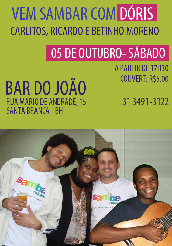 Detalhes. Bar do João – Santa Branca – BH Data05/10/2013 Hora21:00 EndereçoRua Mário de Andrade, 15 Tel.(31 3491-3122 CategoriasShows Descrição. Dóris e banda no Bar do João, Santa Branca – BH
