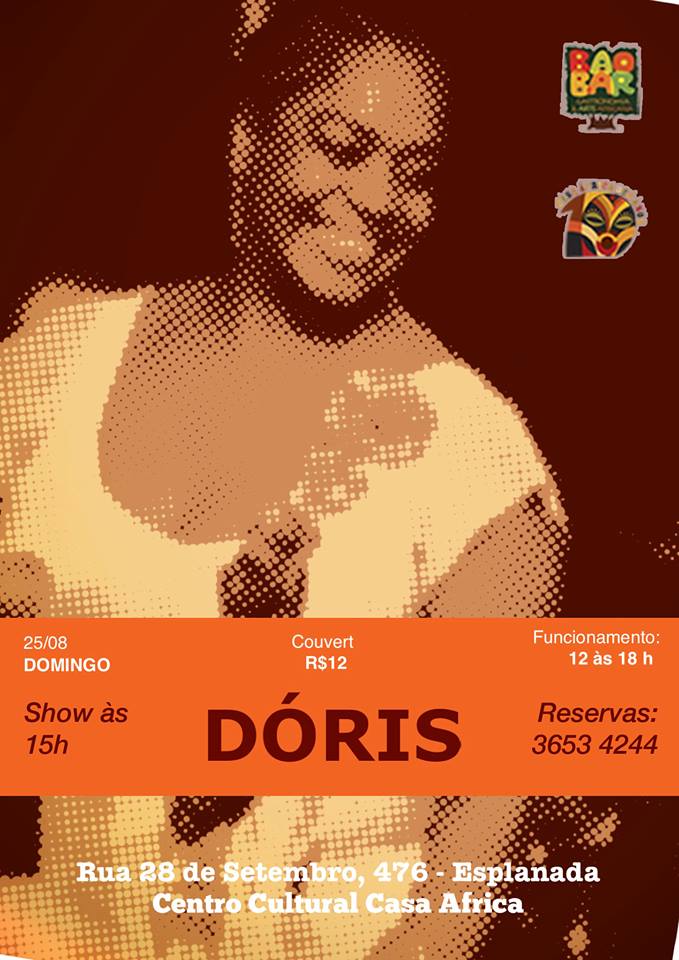 Detalhes. Dóris na Casa África Data25/08/2013 Hora15:00 EndereçoRua 28 de setembro, 476 – Esplanada Tel.(31)3653-4244 CategoriasShows Descrição.