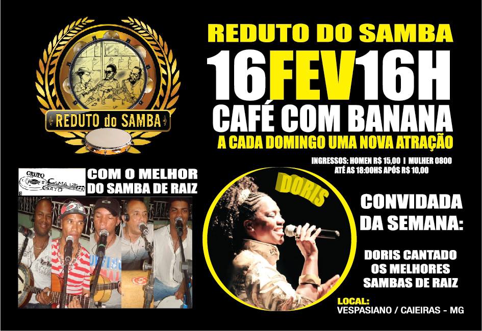 Detalhes. Dóris no Reduto do Samba no Café com Bananas em Vespasiano Data16/02/2014 Hora16:00 Endereço… Tel.(31)9132-0577 e 9132-1078 CategoriasShows Descrição. Data: Dia 16/02 Domingo Evento: Reduto do Samba Local: Café com Banana Horário: 16h Endereço: Vespasiano/Caieiras – MG