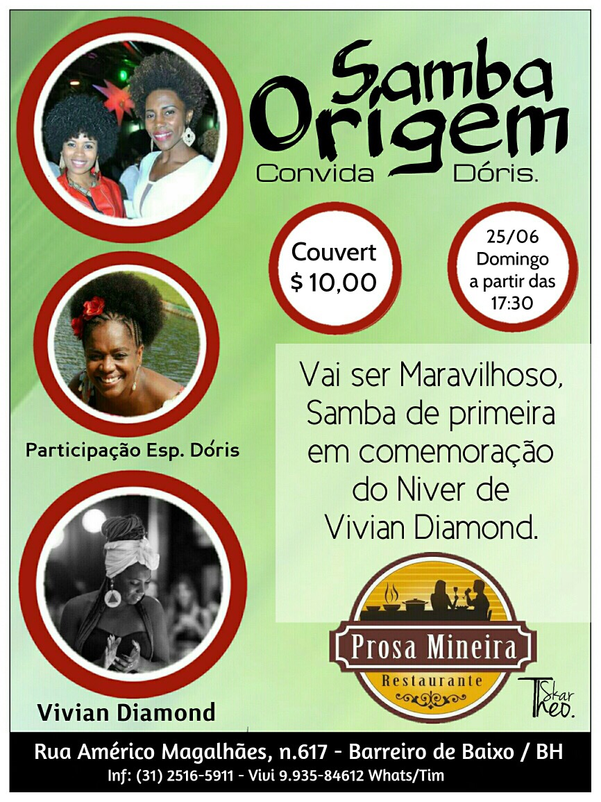 Detalhes. Samba de Origem convida Dóris Data25/06/2017 Hora17:30 EndereçoRua Américo Magalhães n. 617, Barreiro de Baixo CategoriasShows Descrição. Evento: Samba de Origem convida Dóris Local: Restaurante Prosa Mineira Rua Américo Magalhães n. 617, Barreiro de Baixo Dia: 25 de Junho Horário: a partir das 17:30h Couvert: R$ 10,00