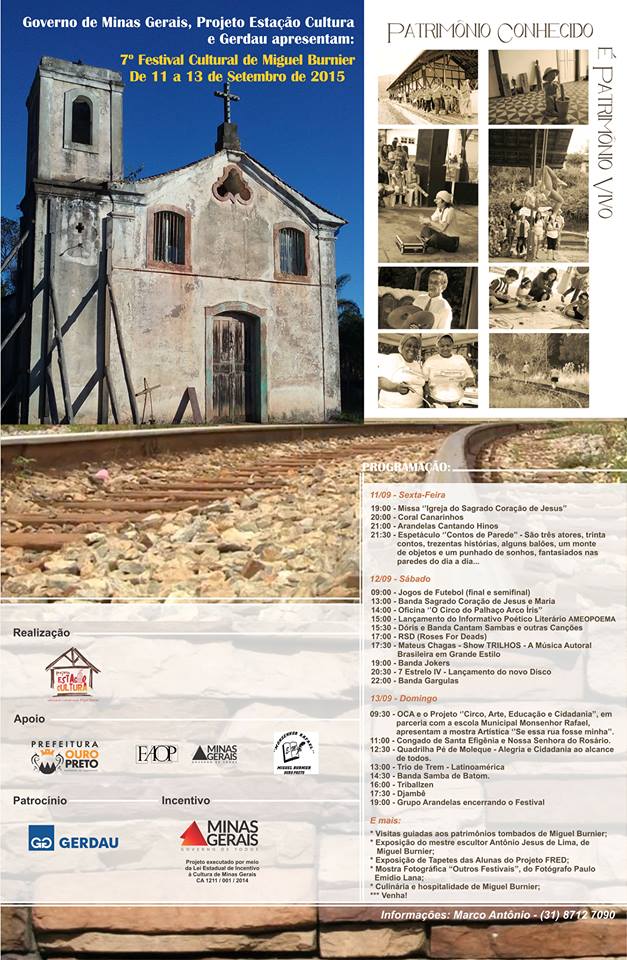 Detalhes. Show Dóris e Banda – 7° Festival Cultural de Miguel Burnier Data12/09/2015 Hora00:00 EndereçoEndereço do evento aqui… Tel.(31)9327-2513 CategoriasShows Descrição. 12/09 – 15h30 – Show Dóris e Banda – 7° Festival Cultural de Miguel Burnier – Distrito de Ouro Preto